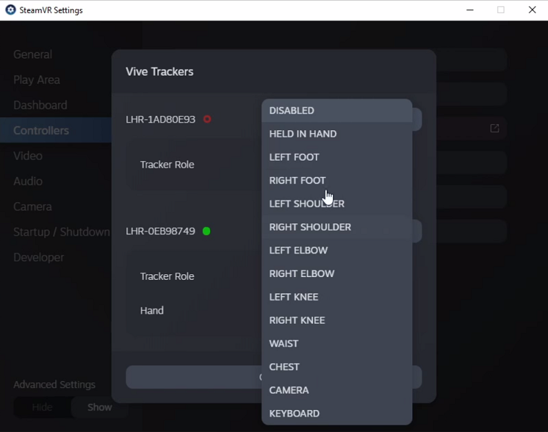 NOTE: This step only needs to be done once when first setting up your trackers. It doesn’t matter which role you assign here, so long as each one is unique on the current PC (and so long as they are not ‘wrist’, ‘ankle’ or 'held in hand'!). For the avoidance of doubt, you may reuse the same tracker role on multiple PCs that are connected to the same multiplayer session - they only need to be unique for each tracker on the same PC.