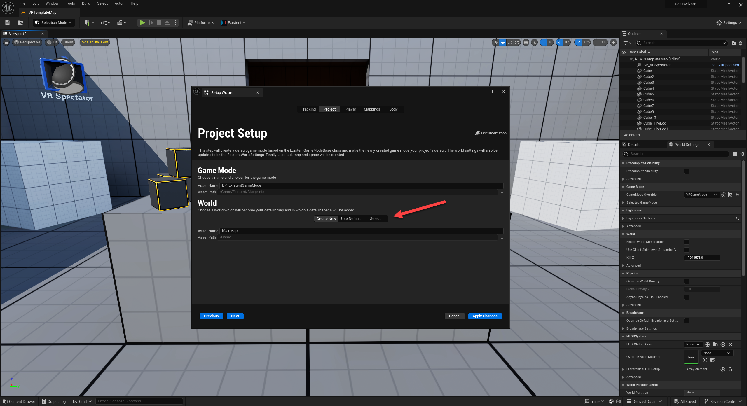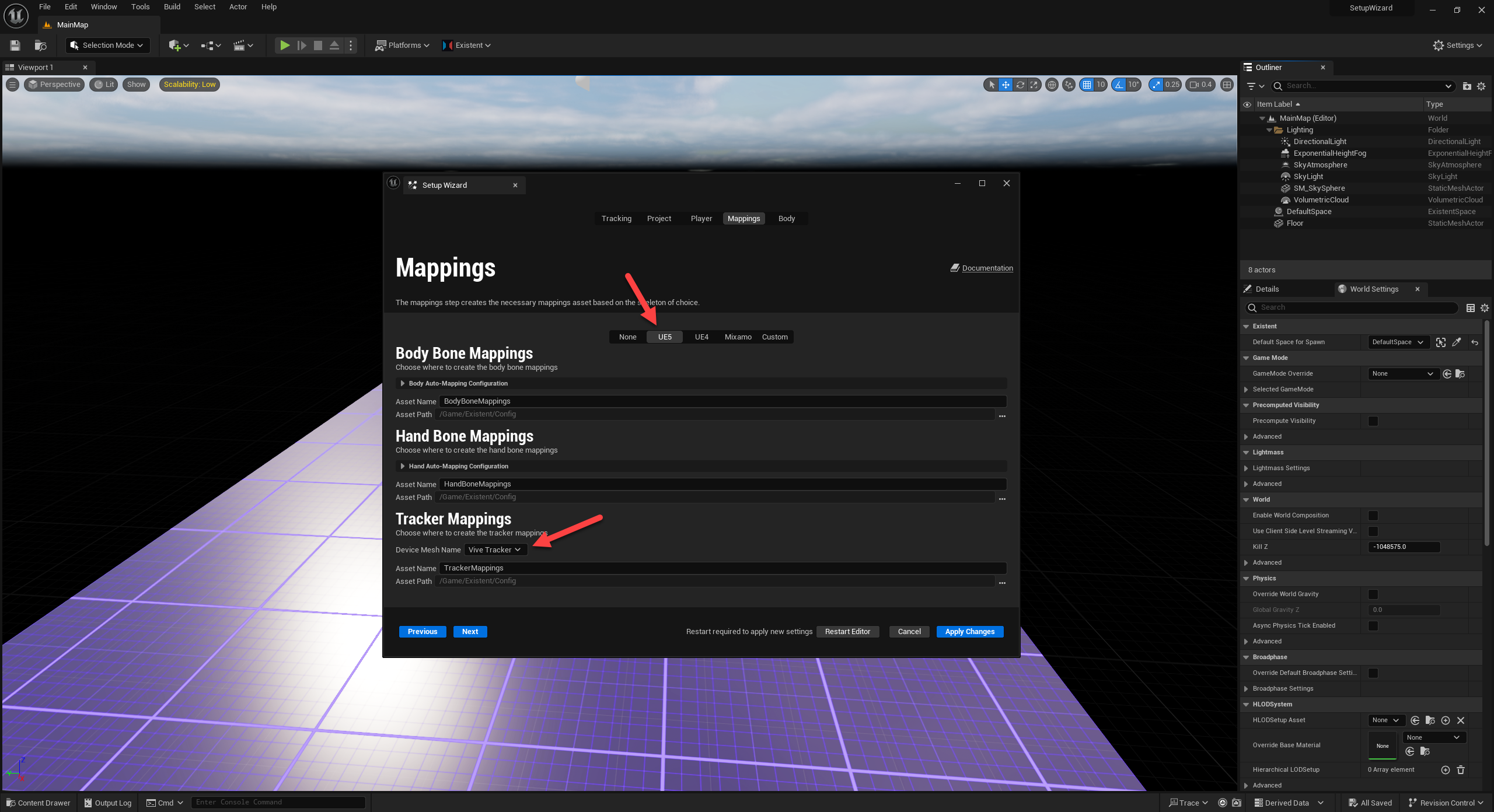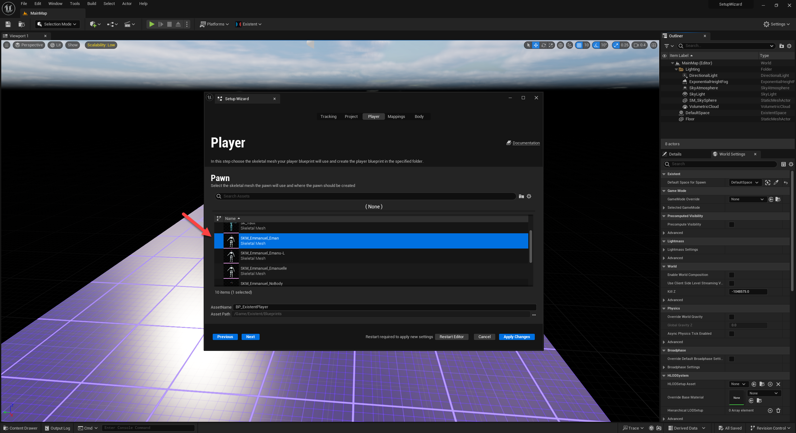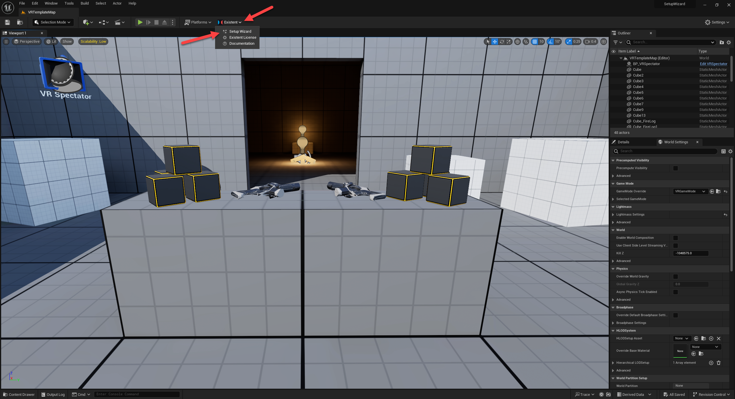 * Project Setup -> The project setup step creates the project game mode, updates the project world settings to use the Existent World Settings class and creates/updates the default map.&#x20;