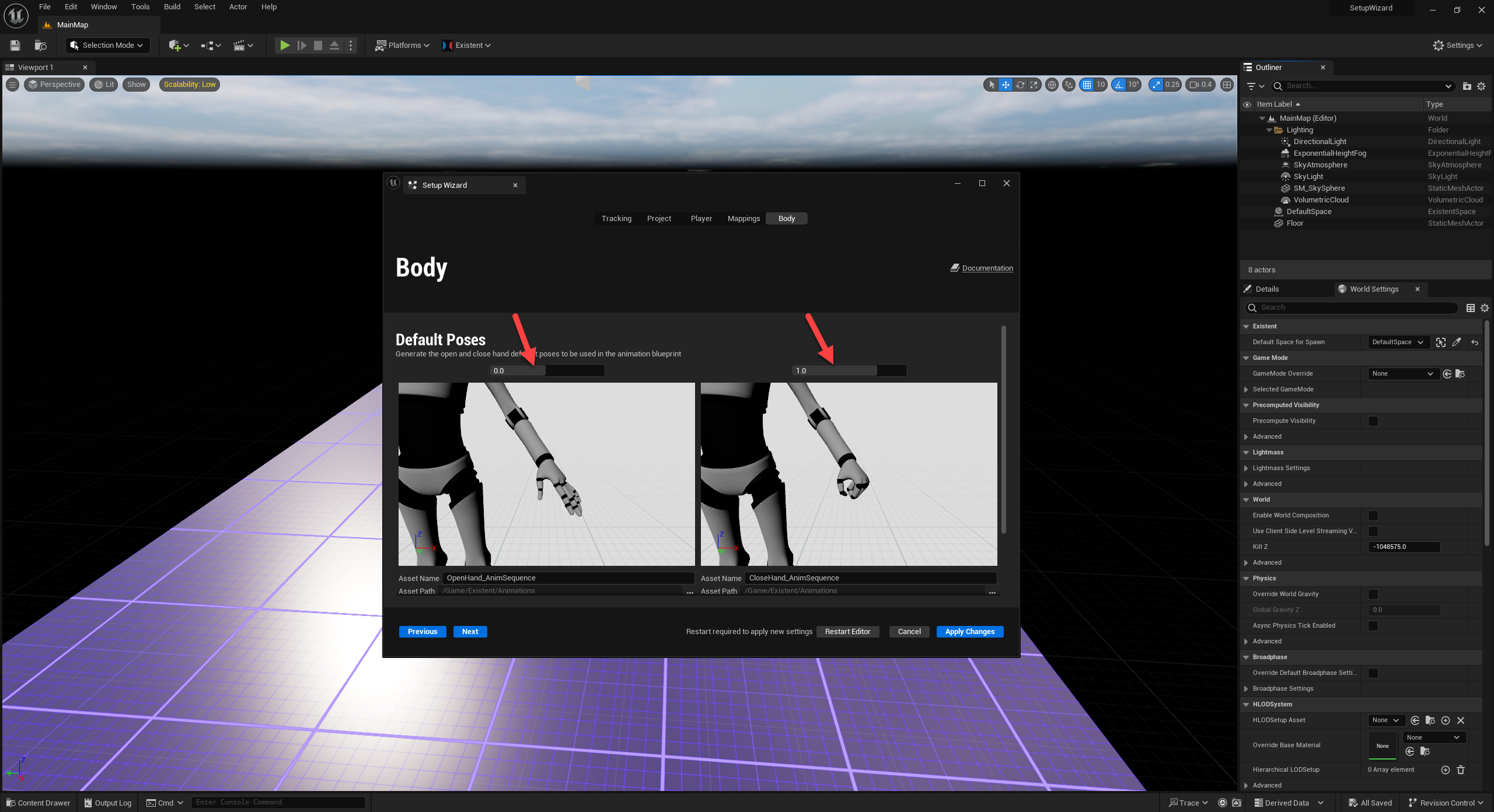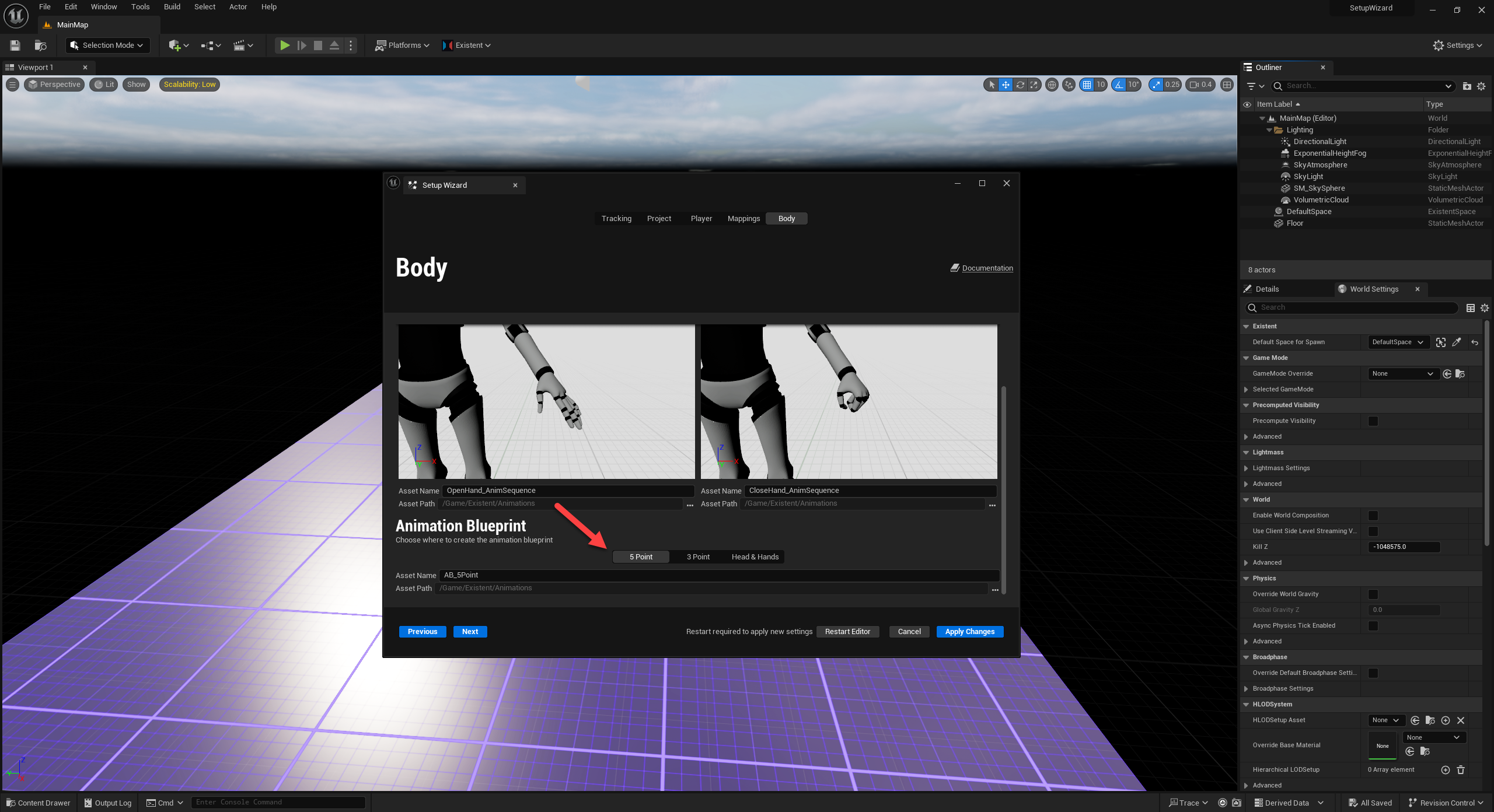 * Body -> The body step creates the open/close hand poses and create the animation blueprint the player blueprint will use. The animation blueprint is dynamically generated based on the body tracking system you have chosen (5 point, 3 point or hand and hands)
