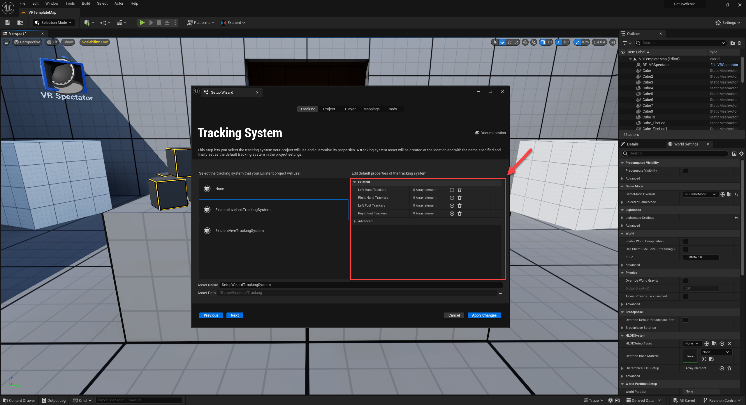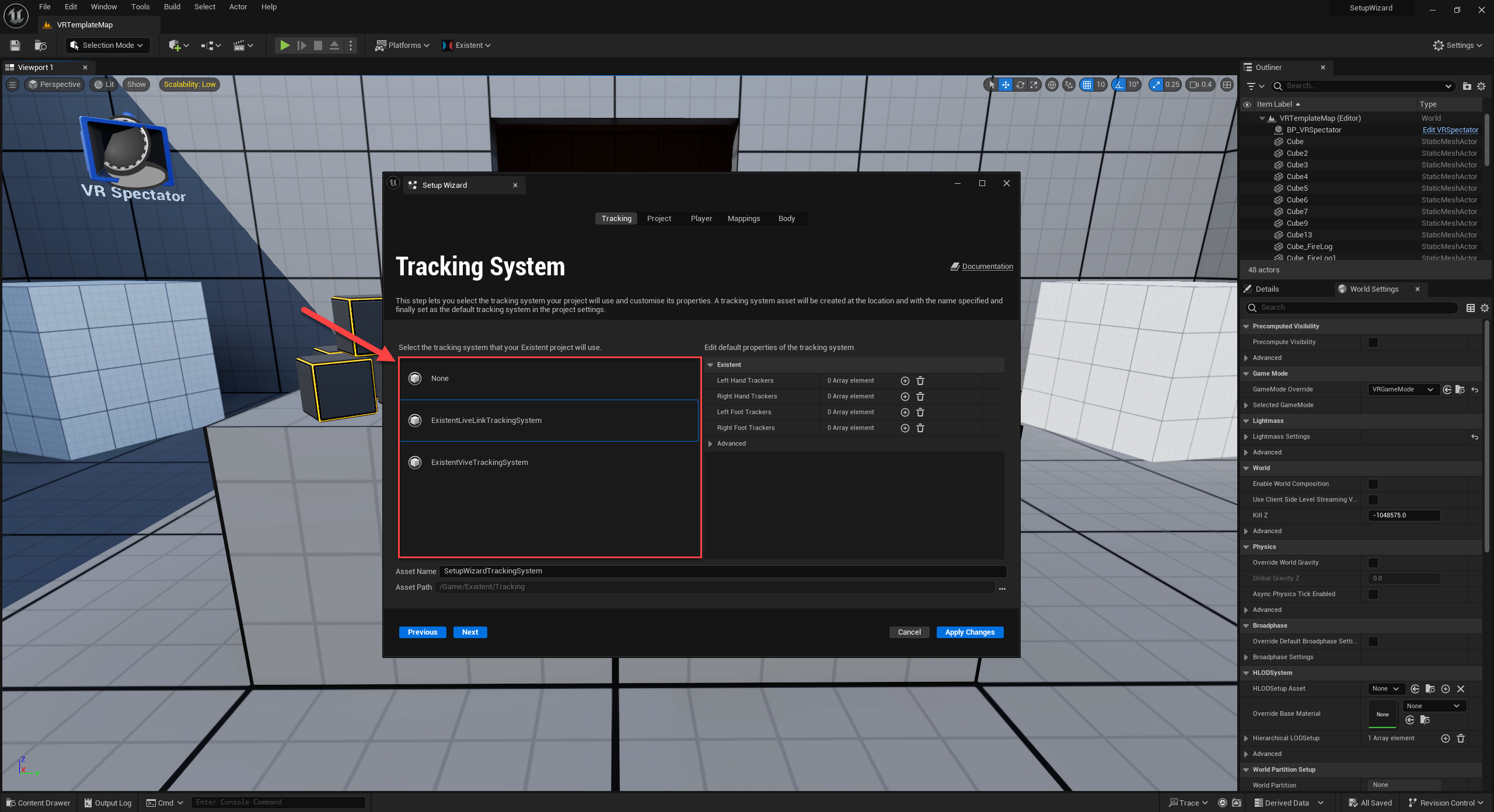 * Tracking -> The tracking step creates a tracking system asset and updates the existent project settings to make the newly created asset the default. This will ensure that any existent system which requires the tracking system asset will use the tracking asset created.